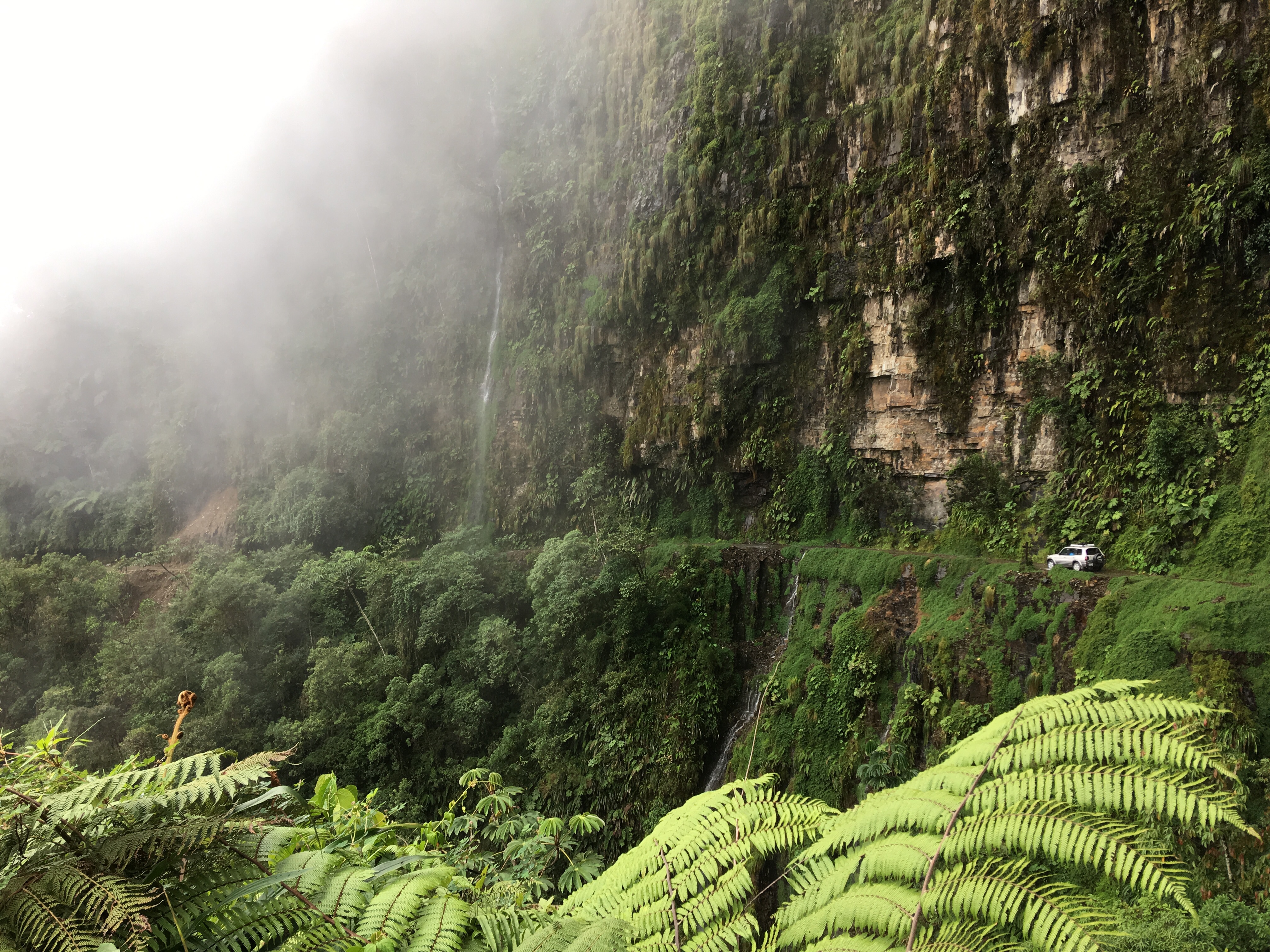 Unser ca. 40 Jahre alter Bus schraubt sich mühsam aus den bolivianischen Yungas von 1200 Metern auf 4700 Meter die steilen Serpentinen hinauf. Die Nacht bricht herein und am Straßenrand geht es hunderte Meter steil den Abhang hinab. Dicke Nebelwände versperren zeitweise jegliche Sicht. Unser Fahrer fährt die Strecke seit 10 Jahren und lenkt unseren Bus mit einem Ohr am Telefon, freudig in die nächste Kurve oder Nebelbank. Ich suche Ablenkung und konzentriere mich aufs Schreiben. Meinen Mitreisenden geht es ähnlich…